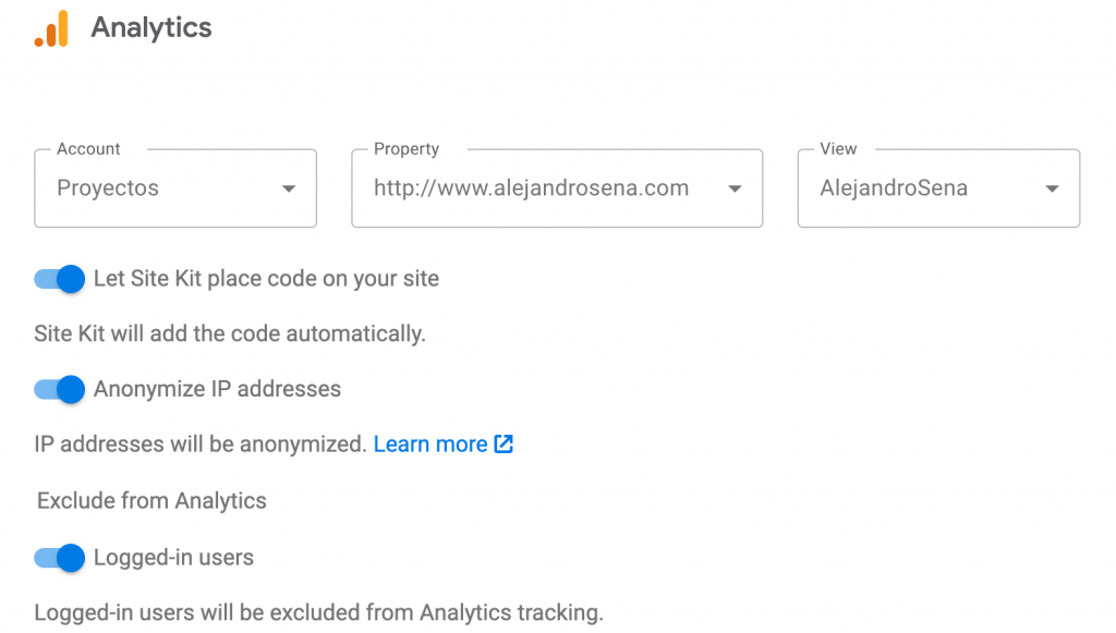 En tu /wp-admin vas a ir a la sección Plugins > Añadir nuevo y arriba a la derecha donde está el buscador vas a ingresar «Site Kit by Google». Le das Instalar, luego Activar y aparecerá un nuevo elemento en el menú de la izquierda de tu administrador de WordPress. Ingresas a «Site Kit» y el proceso te llevará a vincular tu cuenta de Analytics. Es muy sencillo, lo más importante en este caso es activar la opción Let Site Kit place code on your site para que automáticamente agregue el código de seguimiento.